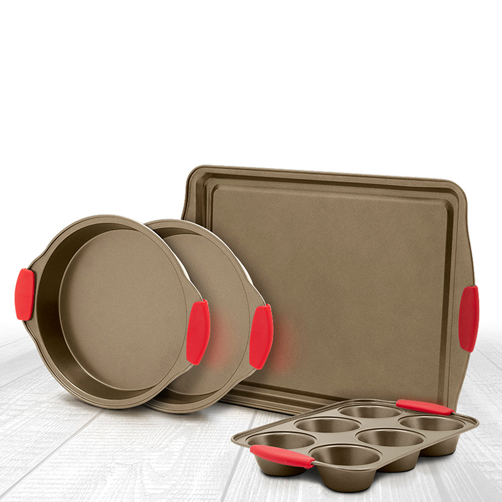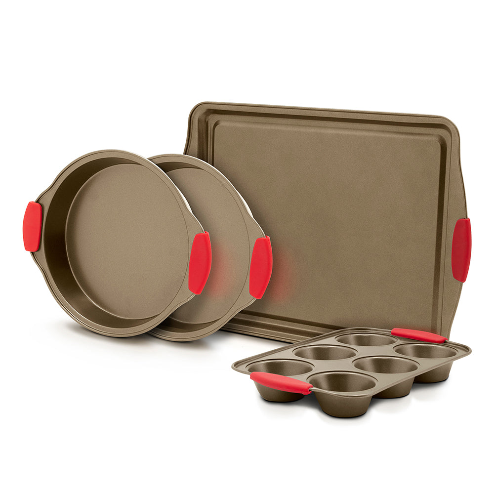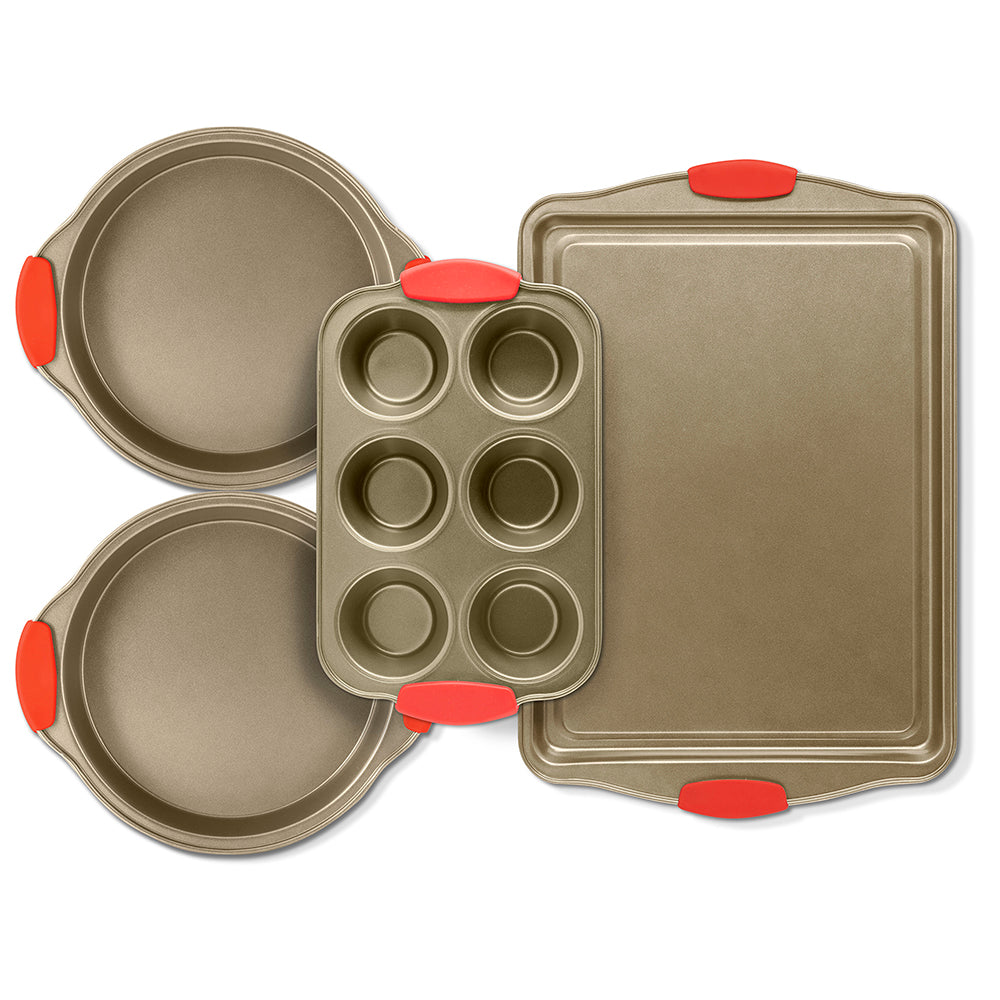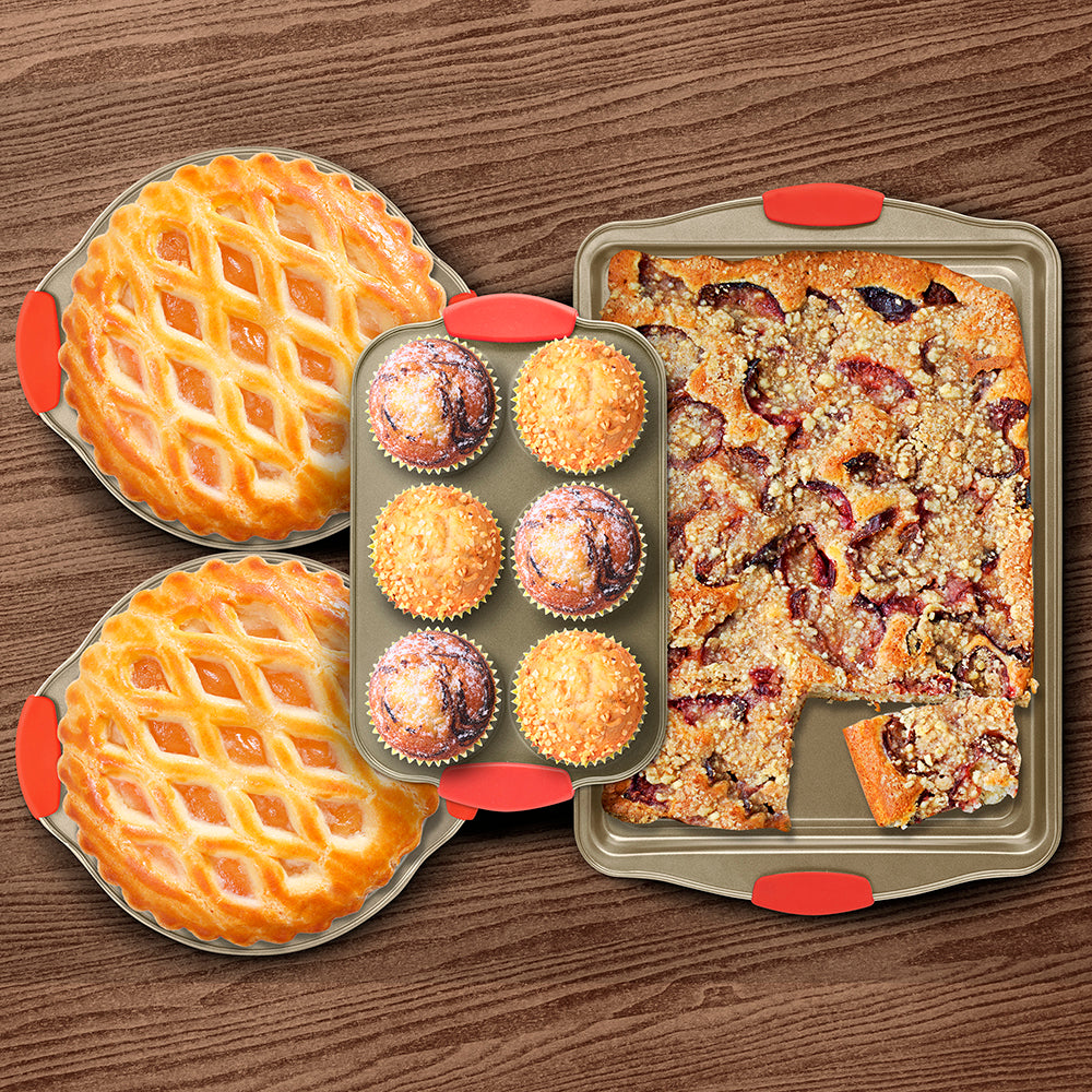 Different sizes cake pans, cup muffin pan and cookie sheet