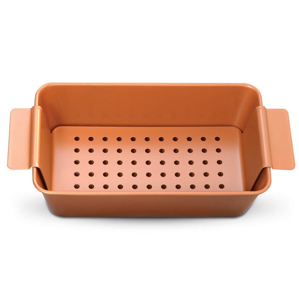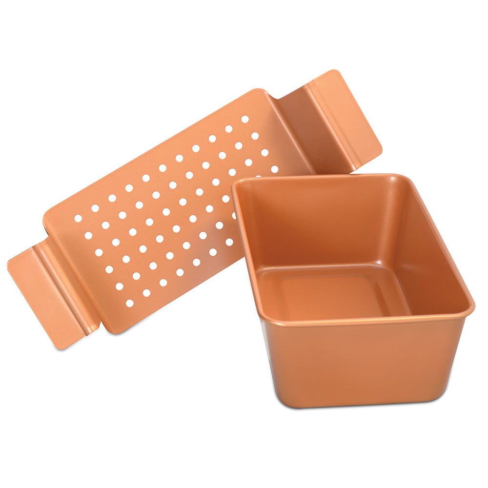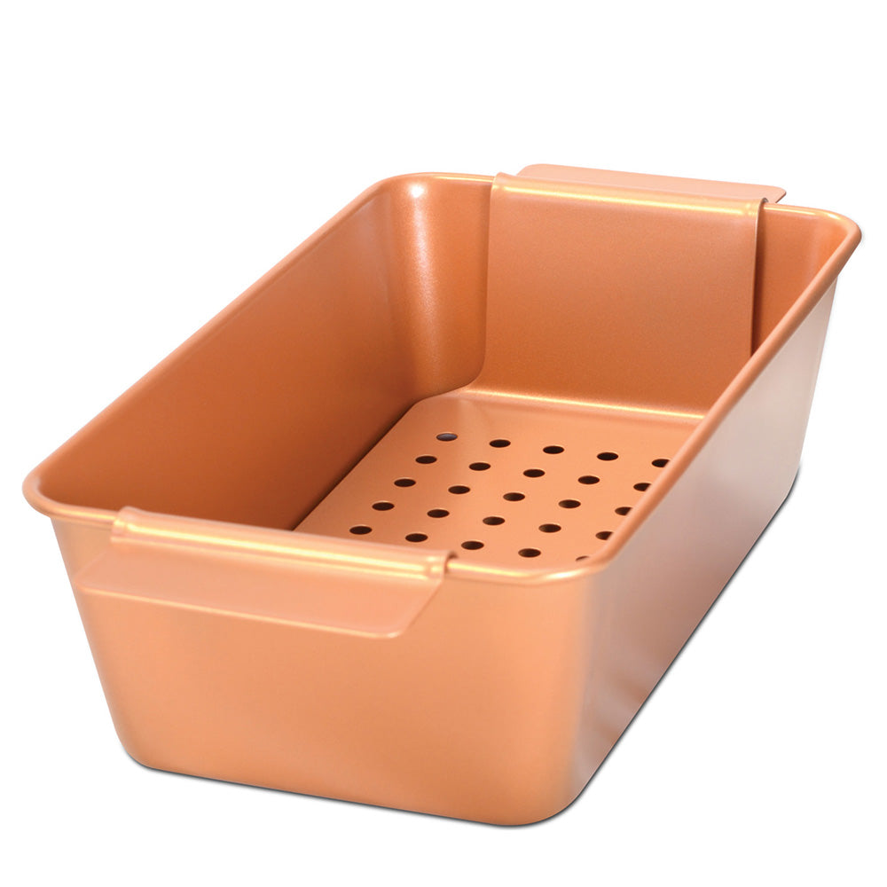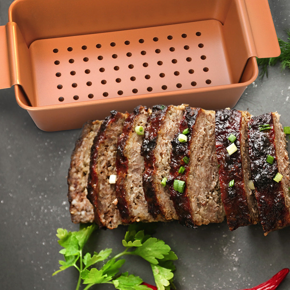 Our Copper Meat Loaf Pan is ideal for making perfect meatloaves every time. Our non stick copper technology paired with the removable tray means no more messy clean up or stuck on food.